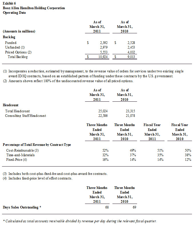 Full Fiscal Year 2011 -- Booz Allen’s 9.1 percent increase in revenue in fiscal 2011 over the prior year was a result of the deployment of additional consulting staff against funded backlog under existing contracts and funded backlog under new contracts in all markets despite funding delays by the U.S. federal government.
