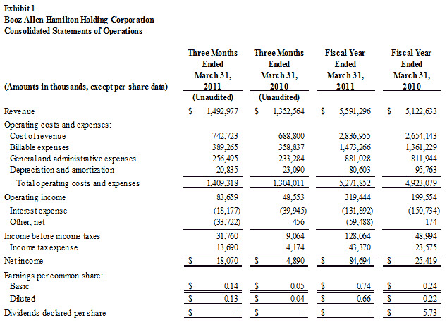 McLean, Virginia – Booz Allen Hamilton Holding Corporation (NYSE:BAH), the parent company of management and technology consulting firm Booz Allen Hamilton Inc., today announced preliminary results for the fourth quarter and full year of its fiscal 2011 with significant revenue and earnings growth over the prior year. Booz Allen also reported strong backlog of $10.9 billion as of March 31, 2011. Booz Allen’s fiscal year runs from April 1 to March 31, with the fourth quarter of fiscal 2011 ending March 31, 2011.