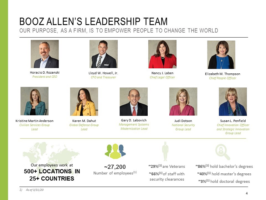 3 WHY INVEST IN BOOZ ALLEN HAMILTON INVESTMENT THESIS UNIQUE MARKET POSITION STRONG FINANCIAL RETURNS 70 - 80 % ADEPS GROWTH BY FY21 + ~2% Dividend Yield 6 - 10 % ~10% ~$1.4B Annual Revenue Growth Adj. EBITDA Margins Capital Deployment = + + Investments in innovation, talent, and capabilities position us to help clients adopt current and new technologies + First mover advantage enhanced by our ability to combine mission knowledge , consulting heritage and technical depth , creating value for critical missions and top priorities OPTION VALUE + Continued investment in new business lines and solutions that will drive future growth FY2018 - FY2021 (1) 6 0 % ADEPS GROWTH THROUGH FY2 0 to $3.18 + ~ 1.5 % Dividend Yield 11.3% 10.1% $333M For a 2 - year total of $697M YEAR TWO Annual Revenue Growth Adj. EBITDA Margin Capital Deployment (1) Guidance as provided on May 26, 2020