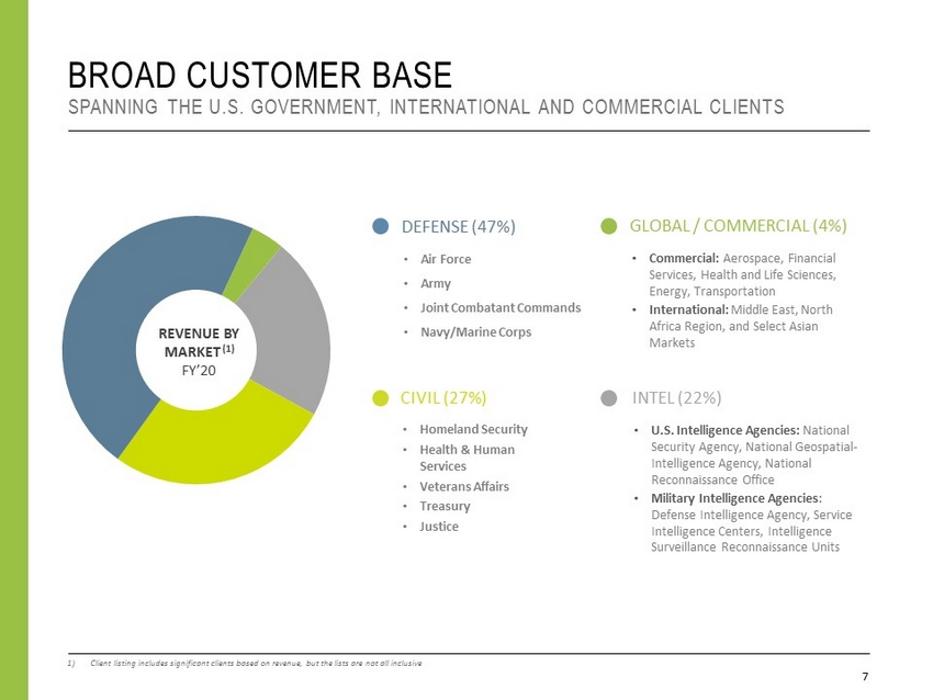 Focuses on delivering transformational solutions in the areas of decision analytics, automation, and data science, as well as new or emerging areas. Combines the power of modern systems development techniques and cloud platforms with machine learning to transform customer and mission experiences. Delivers engineering services and solutions to define, develop, implement, sustain, and modernize complex physical systems. Focuses on active prevention, detection, and cost effectiveness for cybersecurity needs. Focuses on the talent and expertise needed to solve client problems and develop mission - oriented solutions. COMPREHENSIVE SUITE OF SERVICE OFFERINGS STRATEGICALLY ALIGNED WITH CUSTOMER’S CURRENT AND FUTURE PRIORITIES 6 Consulting Analytics Digital Solutions Engineering Cyber
