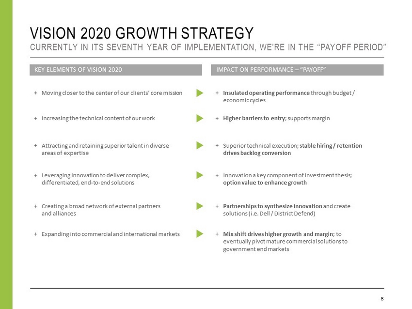 VISION 2020 GROWTH STRATEGY CURRENTLY IN ITS SEVENTH YEAR OF IMPLEMENTATION, WE’RE IN THE “PAYOFF PERIOD” 8 KEY ELEMENTS OF VISION 2020 IMPACT ON PERFORMANCE – “PAYOFF” + Moving closer to the center of our clients’ core mission + Increasing the technical content of our work + Attracting and retaining superior talent in diverse areas of expertise + Leveraging innovation to deliver complex, differentiated, end - to - end solutions + Creating a broad network of external partners and alliances + Expanding into commercial and international markets + Insulated operating performance through budget / economic cycles + Higher barriers to entry ; supports margin + Superior technical execution; stable hiring / retention drives backlog conversion + Innovation a key component of investment thesis; option value to enhance growth + Partnerships to synthesize innovation and create solutions (i.e. Dell / District Defend) + Mix shift drives higher growth and margin ; to eventually pivot mature commercial solutions to government end markets