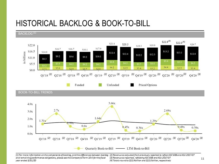 STRONG EARNINGS GROWTH DERIVATIVE OF ROBUST, ABOVE - MARKET ORGANIC REVENUE GROWTH 10 $506 $569 $584 $675 $754 $1.65 $1.80 $1.99 $2.76 $3.18 $450 $520 $590 $660 $730 $800 FY16 FY17 FY18 FY19 FY20 $1.50 $1.88 $2.25 $2.63 $3.00 $3.38 $3.75 Adj. EBITDA ADEPS 2.5% 7.1% 5.2% 8.7% 11.3% (3.5%) (1.3%) 0.5% 4.0% 5.6% -10% -5% 0% 5% 10% 15% FY16 FY17 FY18 FY19 FY20 Booz Allen Gov Services Industry Avg 1) Gov Services Industry includes Leidos, SAIC, ManTech, CACI, and Engility (through Q3 FY18) 2) Organic growth reflects disclosed commentary (through SEC filing, presentation, or transcript) around organic growth performa nce 3) Source: Company presentations, SEC filings, and earnings transcripts ACCELERATING ADJUSTED EBITDA (IN MILLIONS), ADEPS GROWTH ORGANIC REVENUE GROWTH CONSISTENTLY ABOVE MARKET (1), (2), (3)