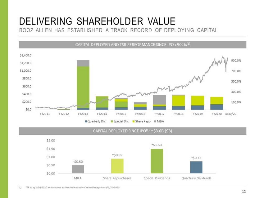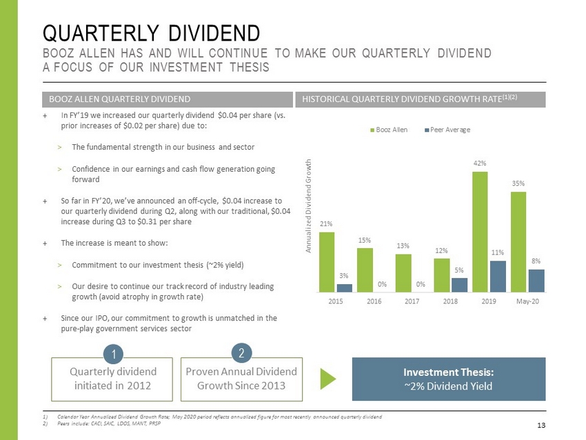 $0.0 $200.0 $400.0 $600.0 $800.0 $1,000.0 $1,200.0 $1,400.0 FY2011 FY2012 FY2013 FY2014 FY2015 FY2016 FY2017 FY2018 FY2019 FY2020 Quarterly Div. Special Div. Share Repo M&A DELIVERING SHAREHOLDER VALUE BOOZ ALLEN HAS ESTABLISHED A TRACK RECORD OF DEPLOYING CAPITAL 12 1) TSR as of 4/30/2020 and assumes dividend reinvested – Capital Deployed as of 3/31/2020 ~ $0.50 ~ $0.89 ~ $1.50 ~ $0.72 $0.00 $0.50 $1.00 $1.50 $2.00 M&A Share Repurchases Special Dividends Quarterly Dividends CAPITAL DEPLOYED AND TSR PERFORMANCE SINCE IPO : 902% (1) CAPITAL DEPLOYED SINCE IPO (1) : ~$3.6B ($B) (100.0% 100.0% 300.0% 500.0% 700.0% 900.0% 4/30/20