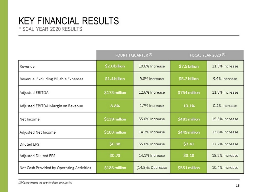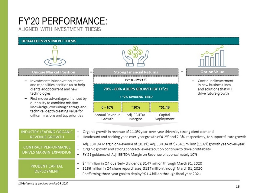 15 KEY FINANCIAL RESULTS FISCAL YEAR 2020 RESULTS (1) Comparisons are to prior fiscal year period FOURTH QUARTER (1) FISCAL YEAR 2020 (1) Revenue $2.0 billion 10.6% Increase $7.5 billion 11.3% Increase Revenue, Excluding Billable Expenses $1.4 billion 9.8% Increase $5.2 billion 9.9% Increase Adjusted EBITDA $173 million 12.6% Increase $754 million 11.8% Increase Adjusted EBITDA Margin on Revenue 8.8% 1.7% Increase 10.1% 0.4% Increase Net Income $139 million 55.0% Increase $483 million 15.3% Increase Adjusted Net Income $103 million 14.2% Increase $449 million 13.6% Increase Diluted EPS $0.98 55.6% Increase $3.41 17.2% Increase Adjusted Diluted EPS $0.73 14.1% Increase $3.18 15.2% Increase Net Cash Provided by Operating Activities $185 million (14.5)% Decrease $551 million 10.4% Increase