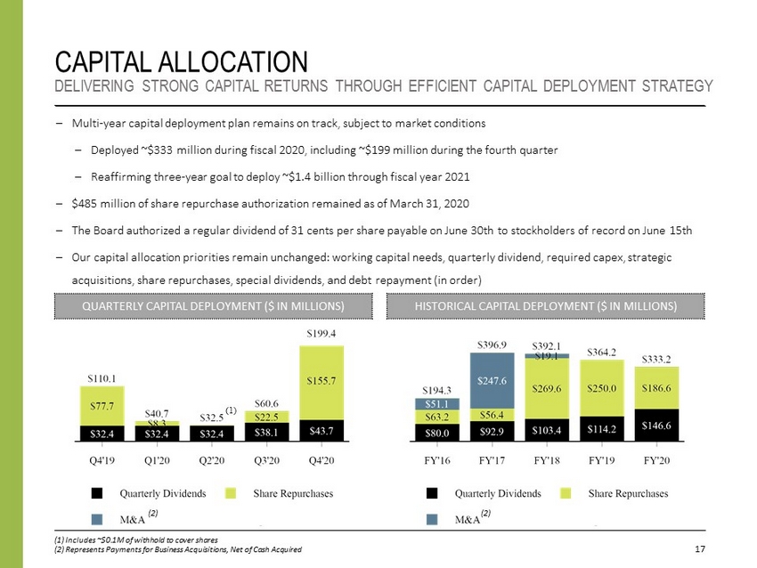 16 FY'20 PERFORMANCE: ALIGNED WITH INVESTMENT THESIS – Organic growth in revenue of 11.3% year - over - year driven by strong client demand – Headcount and backlog year - over - year growth of 4.2% and 7.3%, respectively, to support future growth – Adj. EBITDA Margin on Revenue of 10.1%; Adj. EBITDA of $754.1 million (11.8% growth year - over - year) – Organic growth and strong contract - level execution continue to drive profitability – FY'21 guidance of Adj. EBITDA Margin on Revenue of approximately 10% – $44 million in Q4 quarterly dividends; $147 million through March 31, 2020 – $156 million in Q4 share repurchases; $187 million through March 31, 2020 – Reaffirming three - year goal to deploy ~$1.4 billion through fiscal year 2021 UPDATED INVESTMENT THESIS Unique Market Position Strong Financial Returns Option Value = + 70% - 80% ADEPS GROWTH BY FY'21 + ~2% DIVIDEND YIELD 6 - 10% ~10% ~$1.4B Annual Revenue Growth Adj. EBITDA Margins Capital Deployment – Investments in innovation, talent, and capabilities position us to help clients adopt current and new technologies – First mover advantage enhanced by our ability to combine mission knowledge, consulting heritage and technical depth creating value for critical missions and top priorities – Continued investment in new business lines and solutions that will drive future growth FY'18 - FY ’ 21 (1) (1) Guidance as provided on May 26, 2020 INDUSTRY LEADING ORGANIC REVENUE GROWTH CONTRACT PERFORMANCE DRIVES MARGIN EXPANSION PRUDENT CAPITAL DEPLOYMENT