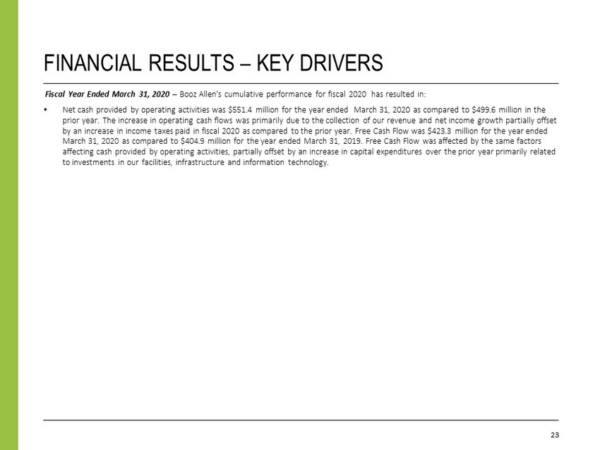 23 FINANCIAL RESULTS – KEY DRIVERS Fiscal Year Ended March 31, 2020 – Booz Allen's cumulative performance for fiscal 2020 has resulted in: • Net cash provided by operating activities was $551.4 million for the year ended March 31, 2020 as compared to $499.6 million in the prior year. The increase in operating cash flows was primarily due to the collection of our revenue and net income growth par tia lly offset by an increase in income taxes paid in fiscal 2020 as compared to the prior year. Free Cash Flow was $423.3 million for the y ear ended March 31, 2020 as compared to $404.9 million for the year ended March 31, 2019. Free Cash Flow was affected by the same factors affecting cash provided by operating activities, partially offset by an increase in capital expenditures over the prior year pri marily related to investments in our facilities, infrastructure and information technology.