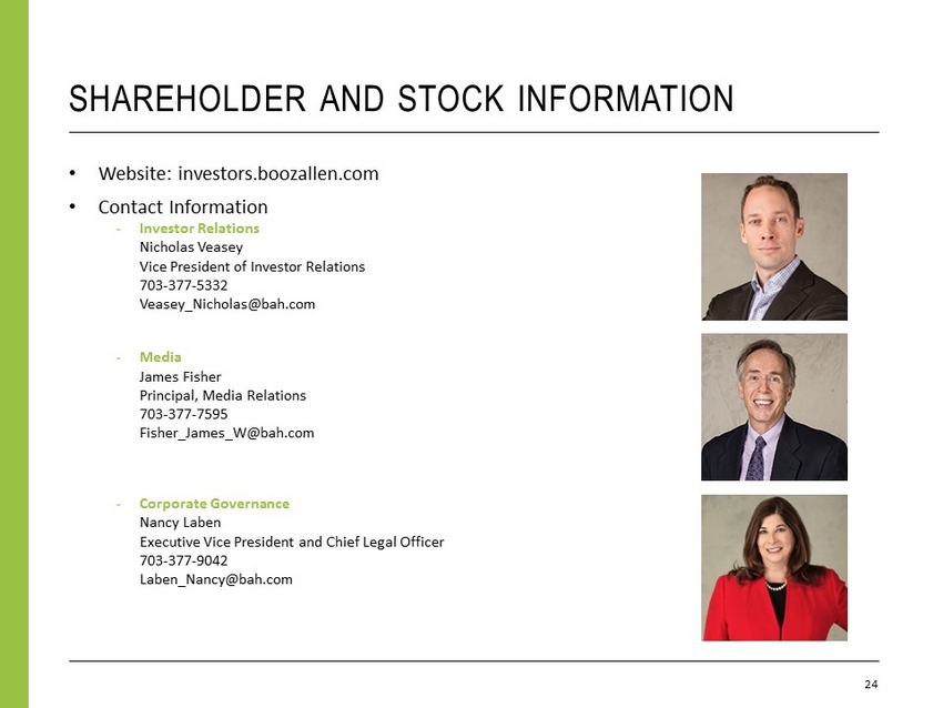 SHAREHOLDER AND STOCK INFORMATION 24 • Website: investors.boozallen.com • Contact Information - Investor Relations Nicholas Veasey Vice President of Investor Relations 703 - 377 - 5332 Veasey_Nicholas@bah.com - Media James Fisher Principal, Media Relations 703 - 377 - 7595 Fisher_James_W@bah.com - Corporate Governance Nancy Laben Executive Vice President and Chief Legal Officer 703 - 377 - 9042 Laben_Nancy@bah.com