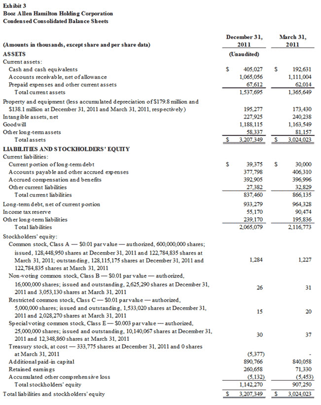 McLean, Virginia– Booz Allen Hamilton Holding Corporation (NYSE:BAH), the parent company of management and technology consulting firm Booz Allen Hamilton Inc., today announced preliminary results for the third quarter of its fiscal 2012 with revenue and earnings growth over the comparable prior year period. Booz Allen also reported backlog of $12.22 billion as of December 31, 2011, and the Company announced that its Board of Directors has declared a cash dividend in the amount of $0.09 per share. Booz Allen's fiscal year runs from April 1 to March 31, with the third quarter of fiscal 2012 ending December 31, 2011.