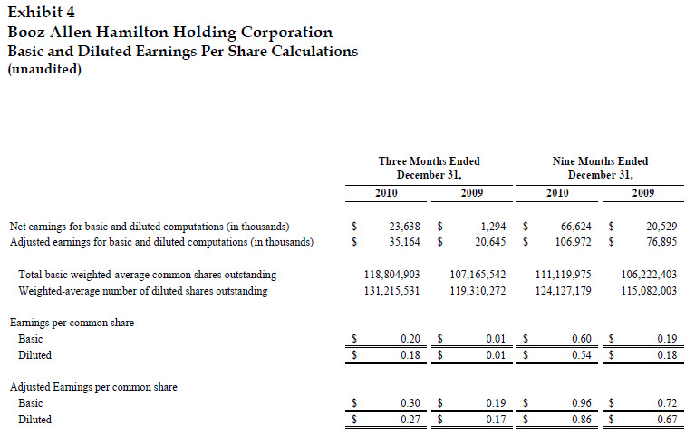 Booz Allen utilizes and/or discusses in this release Adjusted Operating Income, Adjusted EBITDA, Adjusted Net Income, and Adjusted Diluted EPS because management uses these measures for business planning purposes. Booz Allen views Adjusted Operating Income, Adjusted EBITDA, Adjusted Net Income, and Adjusted Diluted EPS as measures of the core operating business, which exclude the impact of the items detailed in the supplemental exhibits, as these items are generally not operational in nature. These supplemental performance measures also provide another basis for comparing period to period results by excluding potential differences caused by non-operational and unusual or non-recurring items. Booz Allen also utilizes and discusses Free Cash Flow, as defined above, in this release because management uses this measure for business planning purposes, to measure the cash generating ability of the operating business after the impact of cash used to purchase property and equipment, and to measure liquidity generally. Booz Allen presents these supplemental performance measures because it believes that these measures provide investors and securities analysts with important supplemental information with which to evaluate Booz Allen’s performance, long term earnings potential and to enable them to assess Booz Allen’s performance on the same basis as management. These supplemental performance measurements may vary from and may not be comparable to similarly titled measures by other companies in Booz Allen’s industry. Adjusted Operating Income, Adjusted EBITDA, Adjusted Net Income, and Adjusted Diluted EPS are not recognized measurements under GAAP and when analyzing Booz Allen’s performance, investors should (i) evaluate each adjustment in our reconciliation of Operating and Net Income to Adjusted Operating Income, Adjusted EBITDA and Adjusted Net Income, and the explanatory footnotes regarding those adjustments, and (ii) use Adjusted Operating Income, Adjusted EBITDA, Adjusted Net Income, and Adjusted Diluted EPS in addition to, and not as an alternative to Operating Income, Net Income or Diluted EPS as a measure of operating results, each as defined under GAAP. Exhibit 5 includes a reconciliation of Adjusted Operating Income, Adjusted EBITDA, Adjusted Net Income, Adjusted Diluted EPS, and Free Cash Flow to the most directly comparable financial measure calculated and presented in accordance with GAAP.